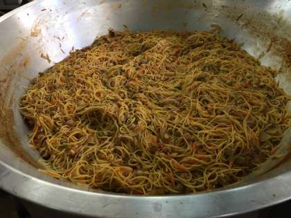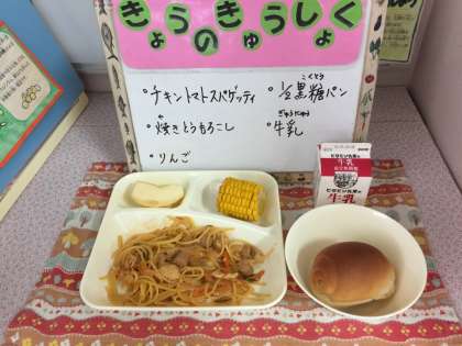 チキントマトスパゲッティ、焼きとうもろこし、りんご、黒糖クレセントロールパン、牛乳