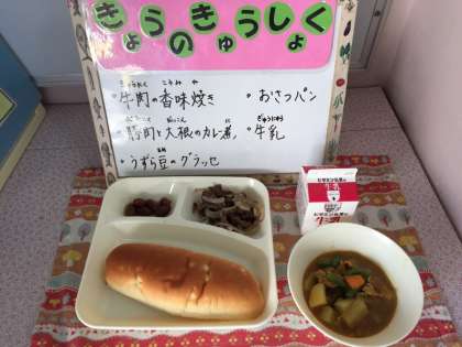 牛肉の香味焼き、豚肉とだいこんのカレー煮、うずら豆のグラッセ、おさつパン、牛乳