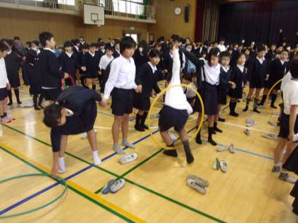 今日の児童集会は「フラフープ送りゲーム」でした。チームで一列に手をつなぎ、フラフープを手を使わずに送っていきます。なかなか上手に運べていましたよ。