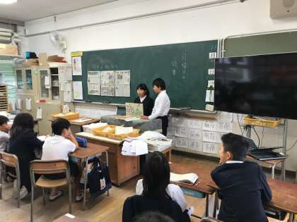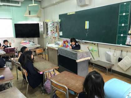 今日から田中小学校では、読書週間を設定していろいろな取り組みを行います。その一つ、図書委員会の皆さんが、朝の会で紙しばいをしてくれます。