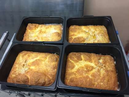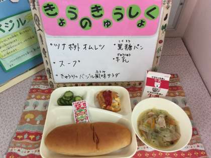 ツナポテトオムレツ、スープ、きゅうりのバジル風味サラダ、黒糖パン、牛乳
