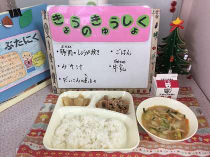 豚肉のしょうが焼き、みそ汁、だいこんの煮もの、ごはん、牛乳