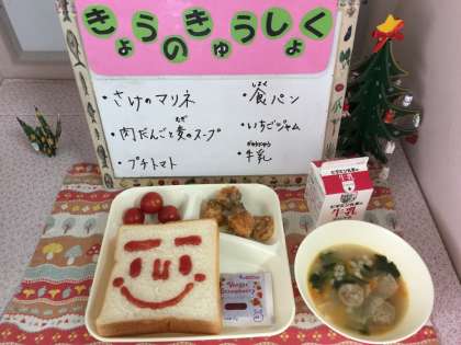 さけのマリネ、肉だんごと麦のスープ、プチトマト、食パン、牛乳