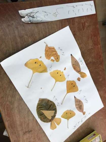 1年生が落ち葉でいろいろなものを作っていました。何ができたかな?