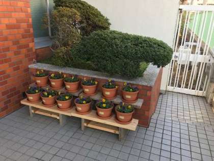 正門の玄関の前に飾っています。花を乗せている台は廃材を利用して、管理作業員さんに作ってもらいました!学校に来られた際は、ぜひご覧ください。