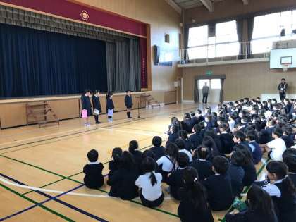 2学期の終業式を講堂で行いました。冬休みの暮らしについてのお話の後、2年生と5年生の代表の子が、2学期の思い出について発表しました。とても上手に言えました。