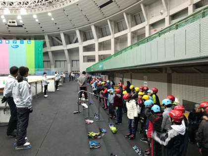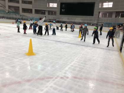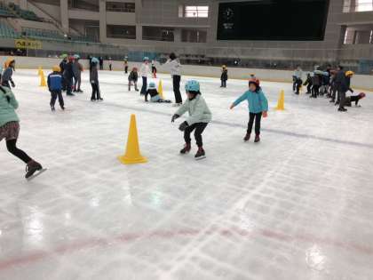 3年生から6年生まで、大阪プールのスケートリンクでスケート体験教室を行いました。講師の先生から滑り方を教えていただき、あまり経験が無い子どもたちも少しずつ滑れるようになりました。