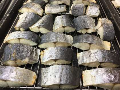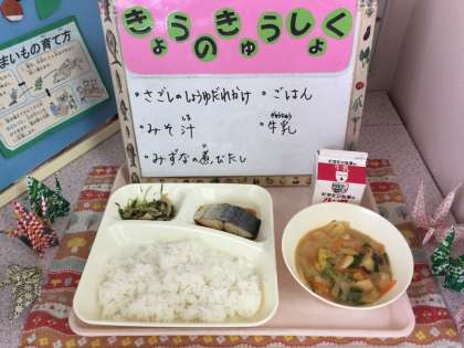 さごしのしょうゆだれかけ、みそ汁、みずなの煮ひたし、ごはん、牛乳