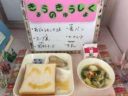 あじのレモンマリネ、スープ煮、固形チーズ、食パン、牛乳、ママレードジャム