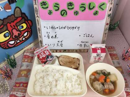 ★給食では、節分の行事献立として、「いわしのしょうがじょうゆかけ」と、「いり大豆」がでます。