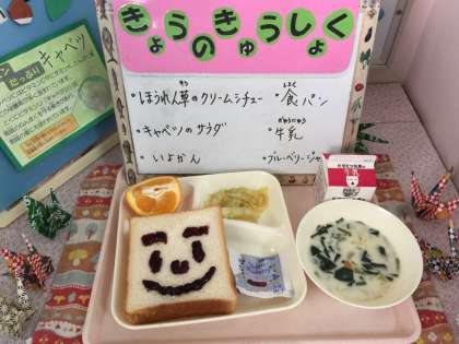 ほうれん草のクリームシチュー、キャベツのサラダ、いよかん、食パン、牛乳、ブルーベリージャム
