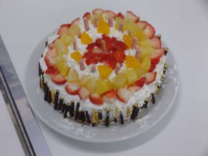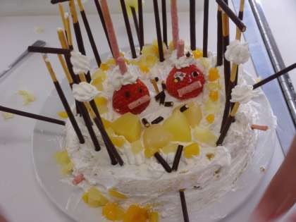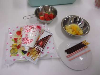 6年生が調理実習で、ケーキを作っています。生クリームやフルーツなどで上手にデコレーションできました。おいしそうですね。