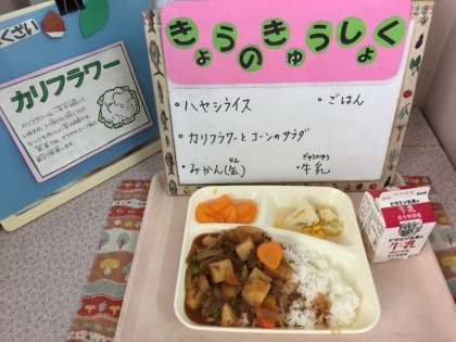 ハヤシライス、カフラワーとコーンのサラダ、みかん(缶)、牛乳