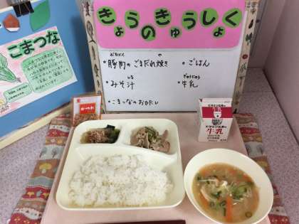 豚肉のごまだれ焼き、みそ汁、こまつなのおひたし、ごはん、牛乳