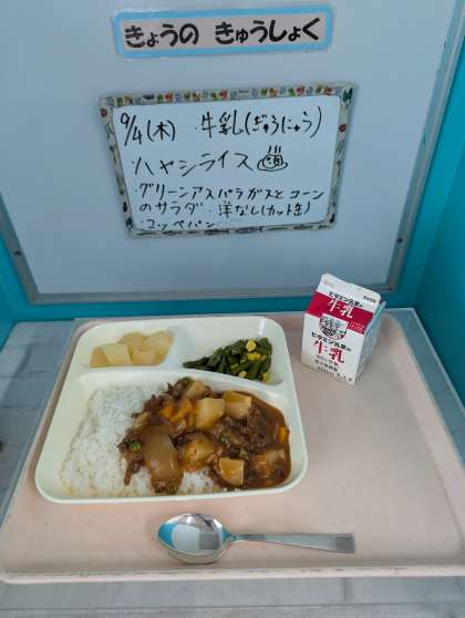 ハヤシライス、グリーンアスパラガスとコーンのサラダ、