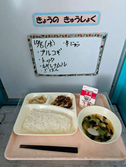 プルコギ、トック、もやしのナムル、ごはん、牛乳
