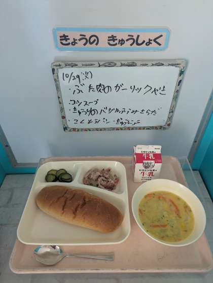 きゅうりのバジル風味サラダ、黒糖パン、牛乳