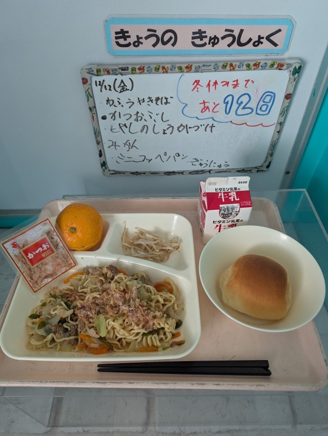 和風焼きそば、かつおぶし、もやしのしょうがづけ、みかん、ミニコッペパン、牛乳