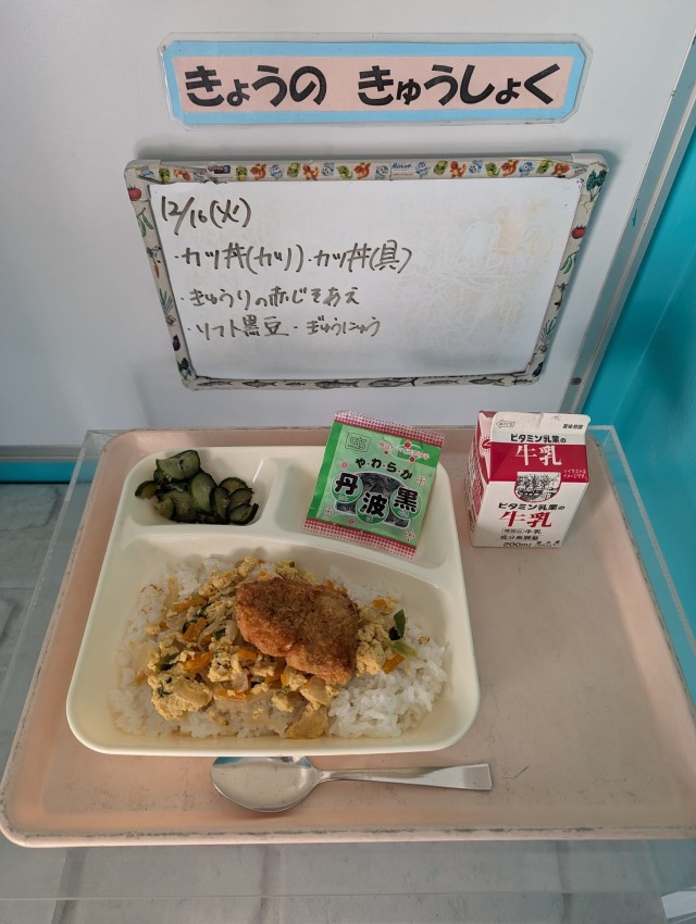 カツ丼、きゅうりの赤じそあえ、ソフト黒豆、牛乳