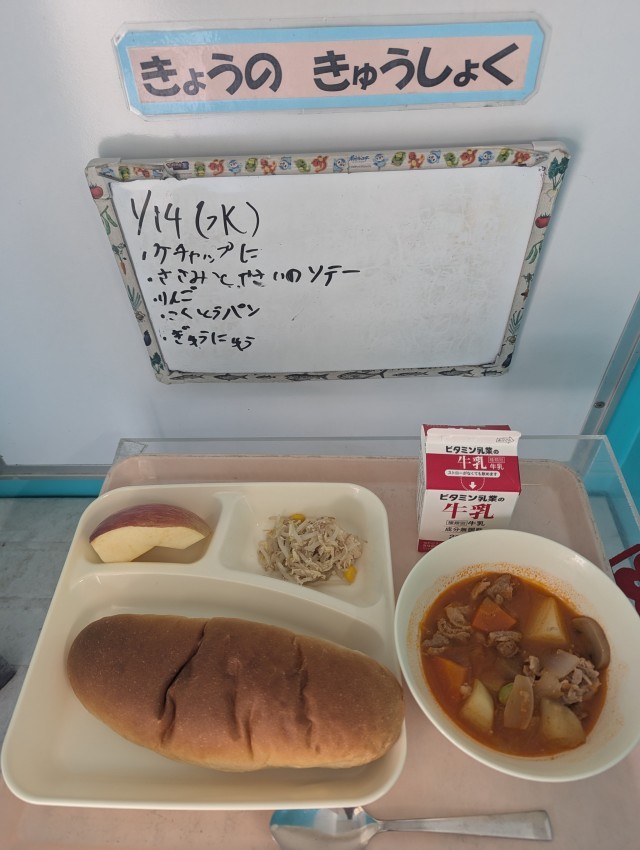 ケチャップ煮、ささみと野菜のソテー、りんご、黒糖パン、牛乳