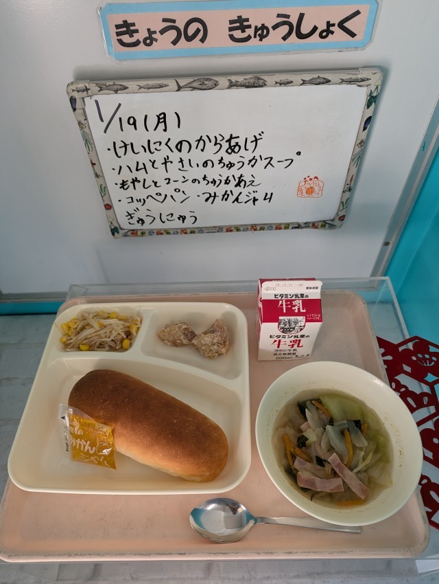 鶏肉のからあげ、ハムと野菜の中華スープ、もやしとコーンの中華あえ、コッペパン、みかんジャム、牛乳
