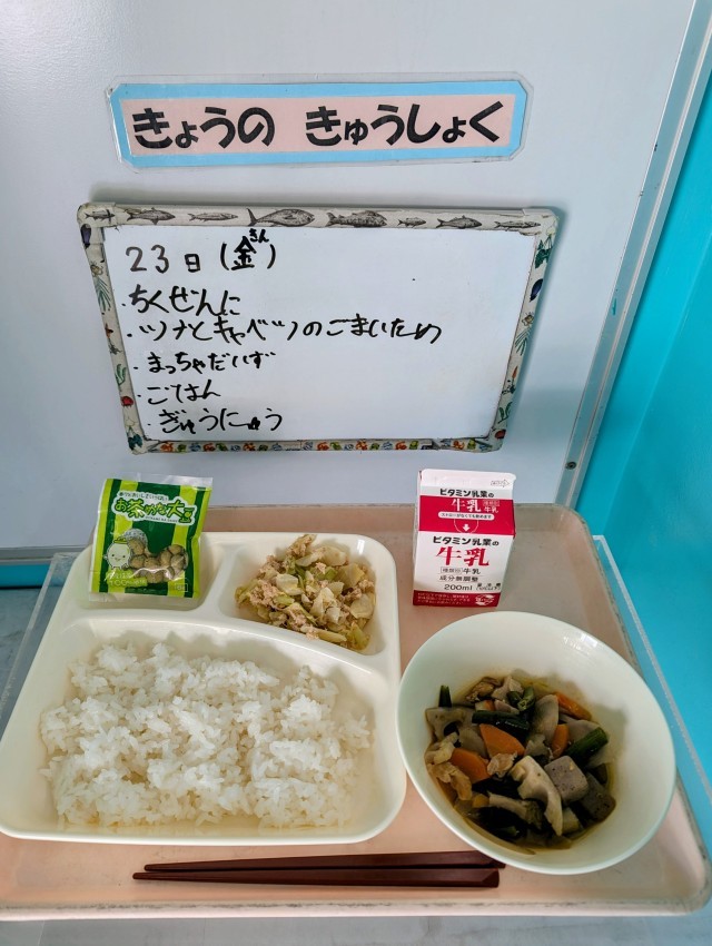 筑前煮、ツナとキャベツのごまいため、まっ茶大豆、ごはん、牛乳