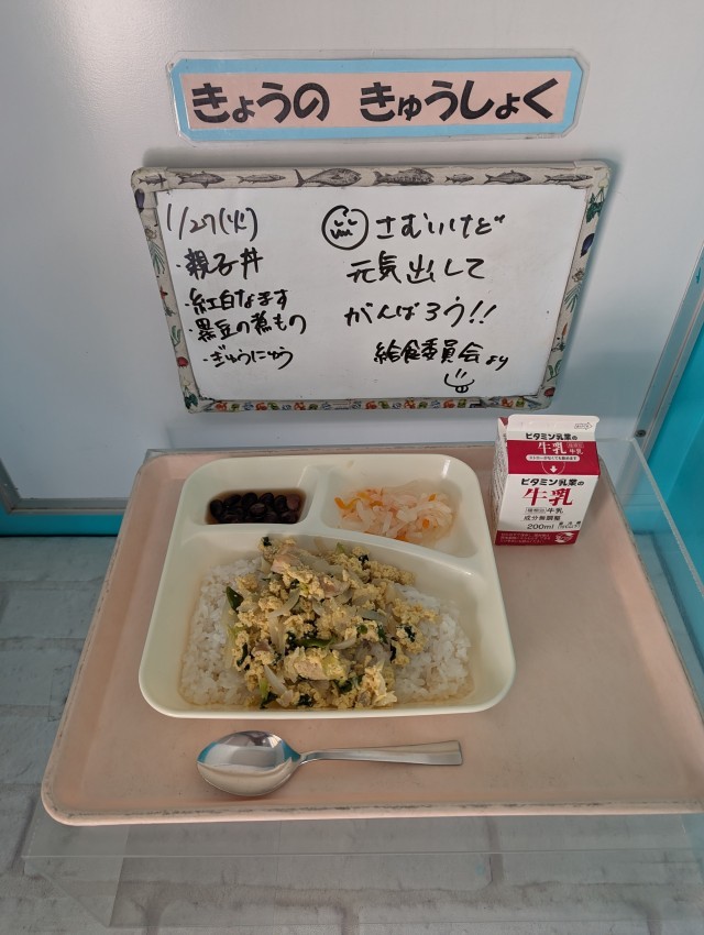 親子丼、紅白なます、黒豆の煮もの、牛乳