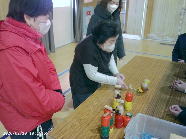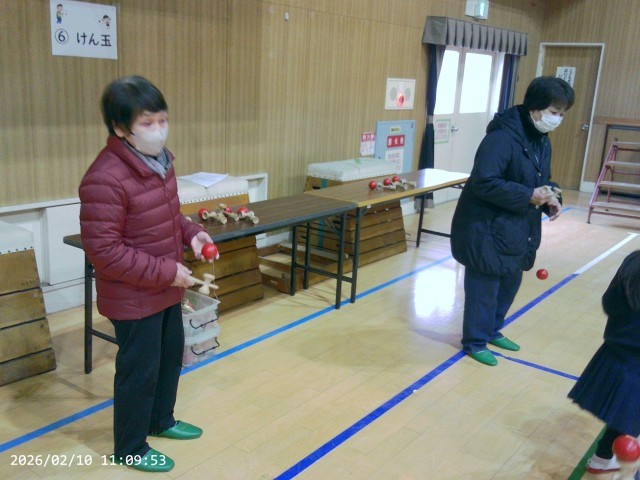 地域のみなさま(女性会のみなさん)にお越しいただき、教えてもらいながら一緒に、昔あそび(おはじき、こま、けん玉、だるまおとしなど)体験をしました。