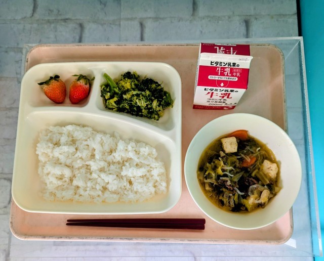 すき焼き煮、ブロッコリーのしょうがづけ、いちご、ごはん、牛乳