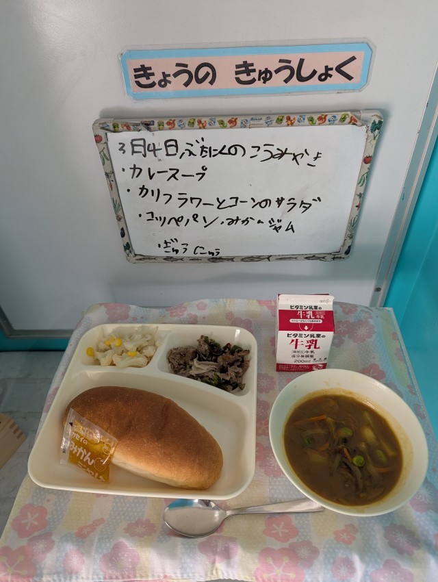 豚肉の香味焼き、カレースープ、カリフラワーとコーンのサラダ、コッペパン、みかんジャム、牛乳