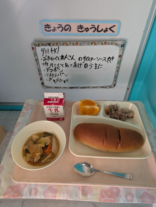 豚肉とれんこんのオイスターソース焼き、鶏肉とあつあげのうま煮、デコポン、黒糖パン、牛乳