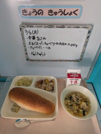 ○今日のこんだて中華おこわ、卵スープ、キャベツのオイスターソースいため、コッペパ...