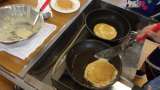 6年生がホットケーキを作っています。みかんやパイン、ジャム、生クリームなどでトッ...