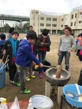 子どもたちも楽しく餅をついています! もちをついた後には、グランドゴルフをして楽...