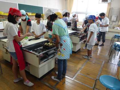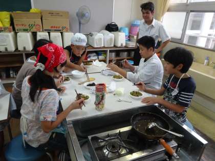 上:夏野菜の調理として「きゅうりと塩昆布の即席あえ」と「キーマカレー」を作りました。さすが6年生です。手際よく作りました。