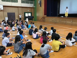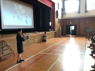 八幡屋小学校では、まず、全校朝会で、校長講話により話をしました。