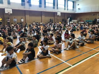 講堂で集まって「ゲームラリー大会」をふりかえりました。