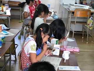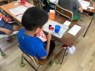 次に むし歯にならないように正しい歯磨きの仕方を学習するために 染め出しをして 自分の歯磨きの磨き残しのところを確かめました。