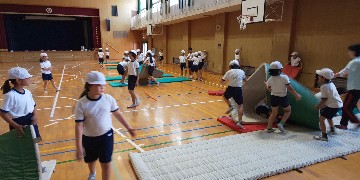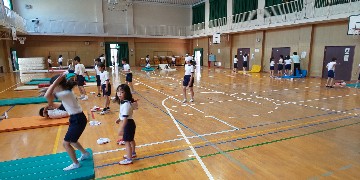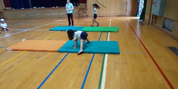 四年生はマット運動をしていました。いろいろな場で自分の課題に取り組みます。今日は前転や後転などのテストもありました。