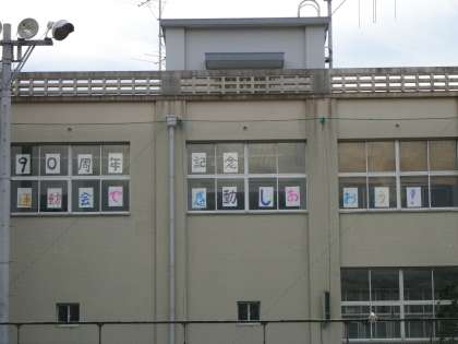 上段:今年の運動会のスローガン「90周年記念運動会で感動しあおう!」を児童会が窓に設置しています。