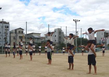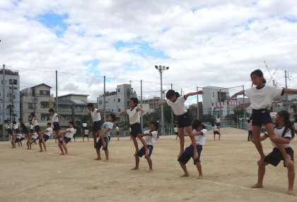 中段・下段:各学年の団体演技も完成に近づいてきました。5・6年生の組体操も日々向上してきて、完成まであと1歩です。本番をお楽しみにしてください。