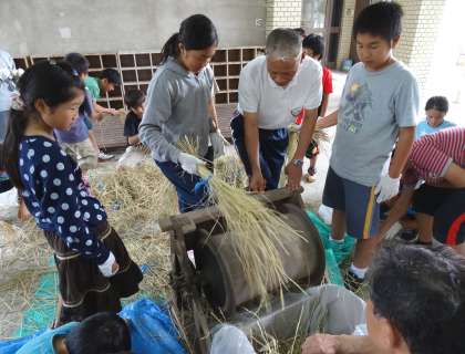 9月に稲を刈った後、干しておいた稲を千歯こきを使って、脱穀しました。