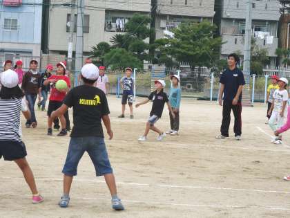 中段:運動場でドッジボール。