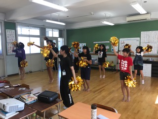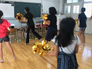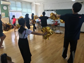 ポンポンを持って リズミカルに楽しく踊っています。