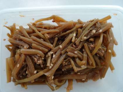 下段:昨日八幡屋小学校の2年生が収穫したさつまいものつるの皮をむきました。そのつるを1年生の先生が、家に持って帰り、「さつまいものつるの佃煮」を作って持ってきてくれました。当時は砂糖は貴重品だったので、こんなにおいしくはなかったと思いますが。