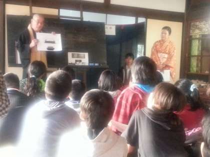 集団疎開で八幡屋国民学校の児童が生活した西光寺に行き、当時の机や黒板や衣類などを見せていただきながら、当時の生活についてお話をお聞きしました。