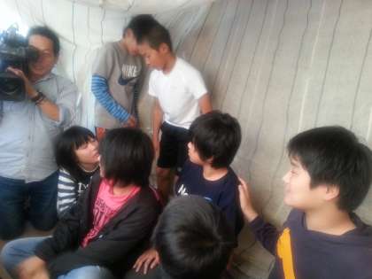 中段:蚊を防ぐために使っていた蚊帳(かや)もつっていただきました。地元のテレビや新聞の取材も来ています。