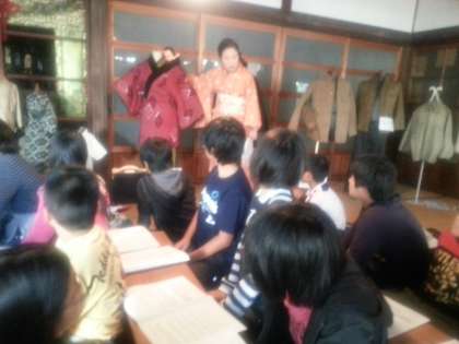 下段:奥様からは、国民服等当時の衣類やかばんなどを見せながら、お話をしていただきました。