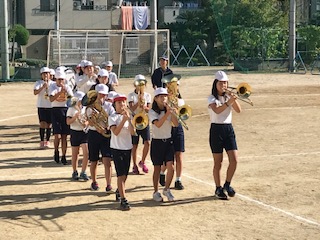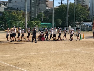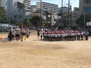 すばらしい天候のもとで、初めて全校児童で練習をします。