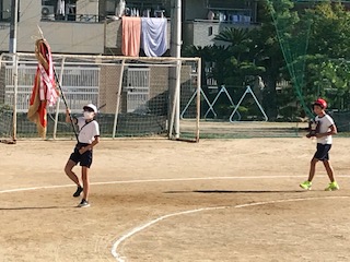 それぞれの旗や盾を持った児童代表の子ども達は